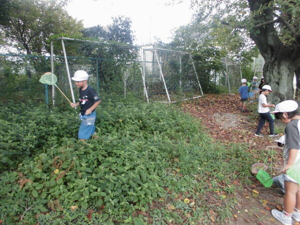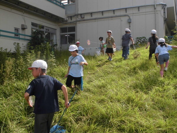 2年生は1時間目に虫取りをしました。「むしさんいないかな?」虫取り網とカゴをもち、楽しそうに、じおんじ山、プール脇、校庭周りの草むらを探していました。「とのさまバッタとりました」と大きな声でみせてくれました。