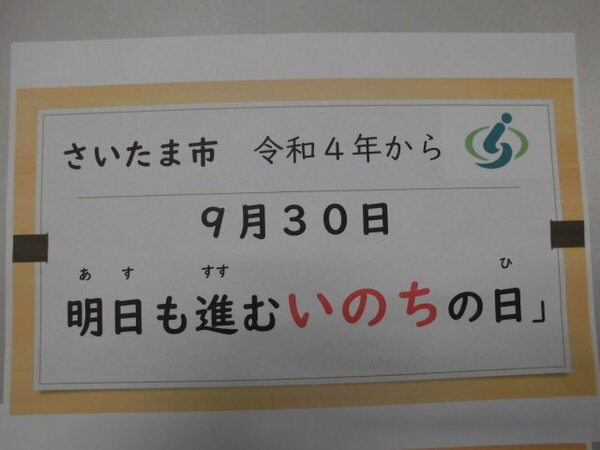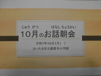 今月は「いのち」をテーマにお話しました。さいたま市では9月30日を「明日も進むいのちの日」としていることと、「毎日がいのちのまつり」という絵本を読みました。自分の命、家族の命、他人の命、動物の命、植物の命、みんなの命を大切にしていきましょう。