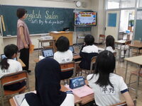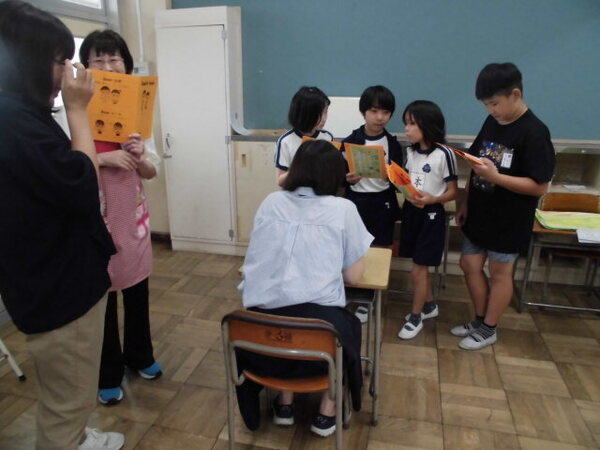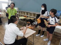業間休みにイングリッシュ・サロンを開きました。参加は自由です。チームに分かれて、日本語のお題を英語の先生に英語で伝えます。日本語のお題には、今まで習ったことのない単語や動詞が入っていますが、身振り手振りを使って相手に伝えるゲームです。英語のコミュニケーション能力を伸ばすことが目標です。みんな楽しそうに取り組んでいました。今後、イングリッシュ・サロンは、毎週火曜日の業間に行っていく予定です。
