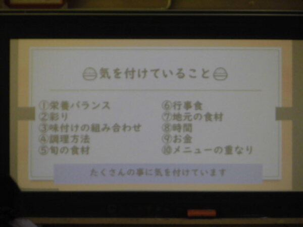 給食献立について学習しました。栄養士の熊谷先生より、献立作成にかかわる10のポイントを教えてもらいました。この学びをもとに、次は、自分で我が家の献立を考えるそうです。