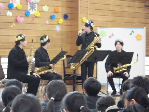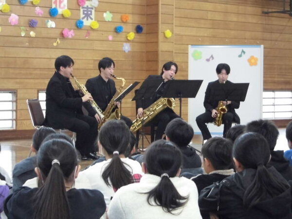 ソプラノ、アルト、テナー、バリトンの4種類のサクソフォンによる四重奏コンサートを鑑賞しました。「G線上のアリア」、「ジュピター」、映画「ジュラシック・パーク」メドレー等、全7曲に加えて、最後には「慈恩寺小学校校歌」を演奏してくれました。
