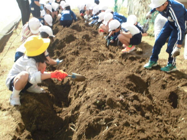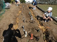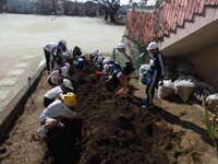 みんなで畑をつくりました。スコップで溝を掘り、そこへ枝、木の実、落ち葉を入れて土をかぶせ大きな畝を作りました。畝の上には、籾殻をかぶせました。4月になったら、野菜の種をまきます。