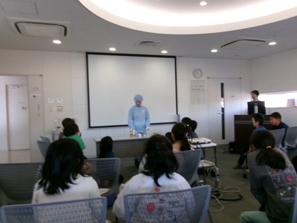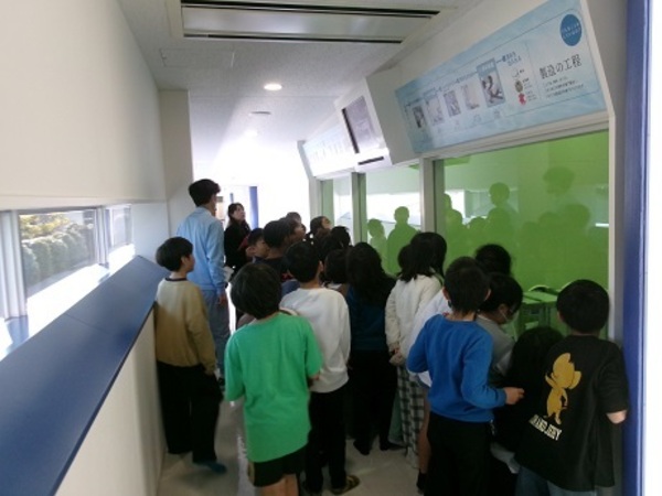クレンジングの製造過程を見学させてもらいました。原料を大きなタンクへ入れる部屋、液体をボトルへ詰める部屋、箱へ入れる部屋等、丁寧に説明してくれました。子どもからは、「大きくなったらこの工場で働きたいです。」という感想もきかれました。