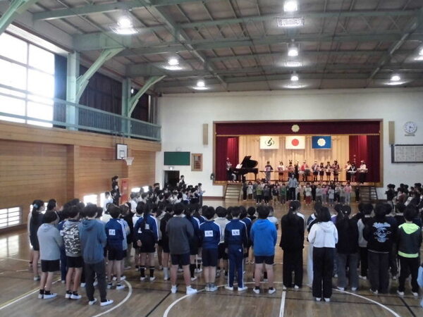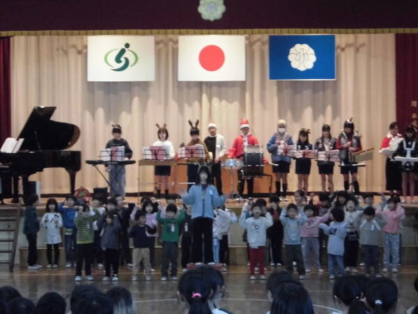 12月の曲は「あわてんぼうのサンタクロース」です。1年生が曲にふりとセリフを付けて発表しました。最後に、みんなで楽しく歌いました。