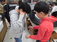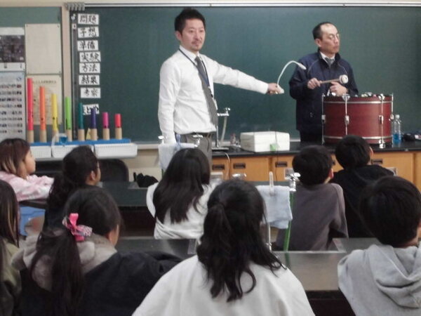 宇宙科学館より2名の指導主事が来校し、3年生対象に、理科の授業を実施しました。テーマは「音」です。音叉、真空ボックス、大太鼓、空き瓶等、色々な実験道具を使って、音の伝わる不思議を教えてくれました。