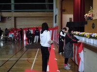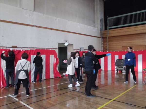 子どもたちが下校した後、体育館に紅白幕張り等、卒業式準備をしました。いよいよ本番まで休みの日を抜いて3日となりました。