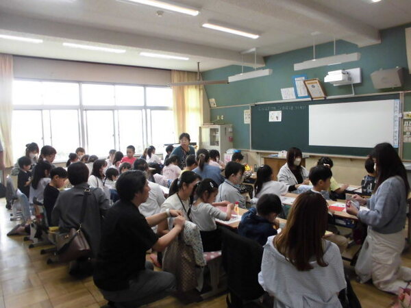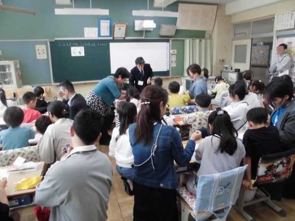 1年生にとって初めての授業参観日、子どもたちはおうちの方と一緒に「こいのぼり」をつくりました。
