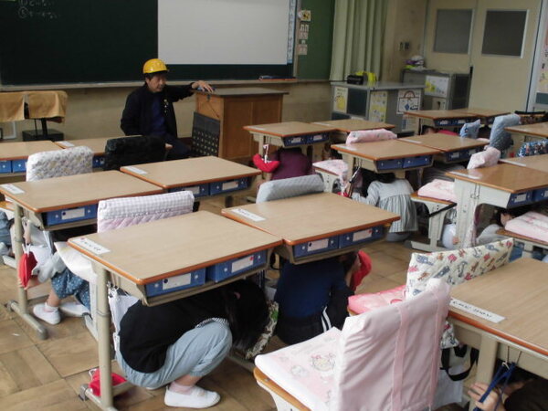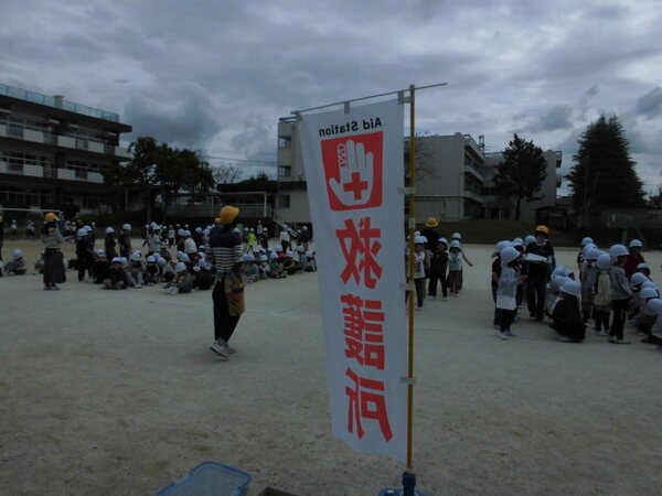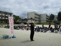 地震発生時を想定した避難訓練を実施しました。避難指示放送から4分59秒後に校庭に集まることができました。みんな真剣な表情で取り組んでいました。