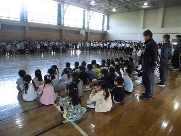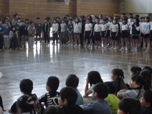 全校で体育館に集まって音楽朝会を実施しました。今月の歌は「離任式の歌」と「校歌」です。4月30日の離任式の日に向けて、みんなで心を込めて歌いました。