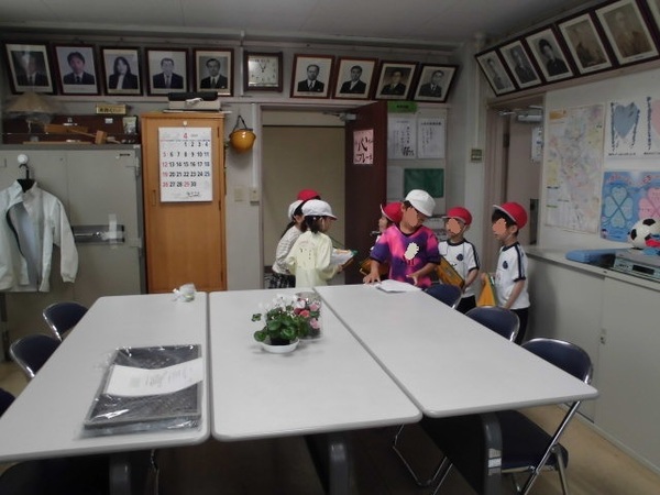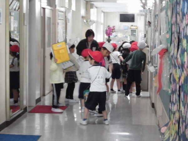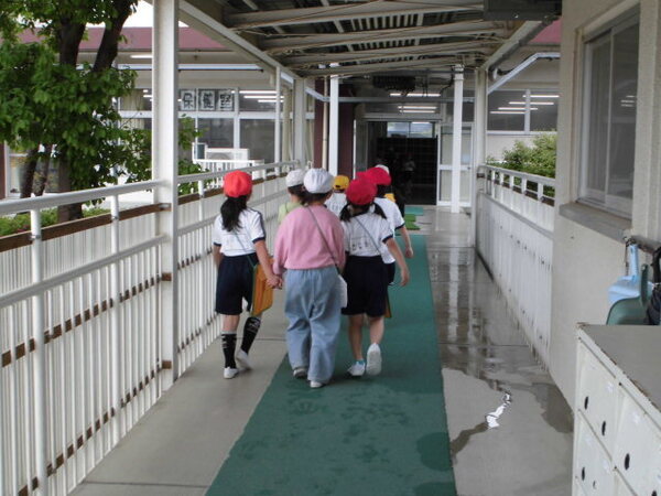 2年生が1年生と手をつないで、学校の中のいろいろな場所を案内してくれました。教室に入るときは、「しつれいします。」、出るときは「しつれいしました。」と言うんだよ。2年生が1年生へ優しく教えてあげていました。